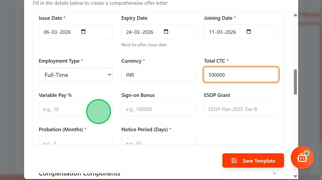 - Mention Variable Pay, Sign-on Bonus and ESOP Grant if needed